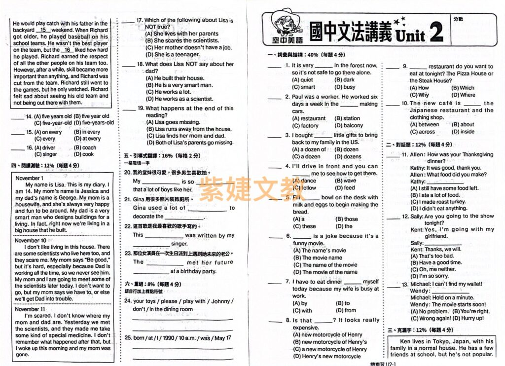 • 搭配隨堂練習題及課後單元測驗,在課堂上實際演練文法重點驗收學習成效。