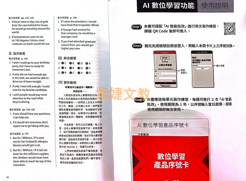 我們也在每個單元提供「加分祕笈」,教你如何避免寫作常犯的錯誤、善用各種轉折詞和修飾語等,幫助你寫出更好的文章。各單元最後的「寫作練習」有作文題目讓你應用該單元所學,當中的寫作引導帶你一步一步寫出內容。你可以掃描題目下方的QR code進行線上寫作,我們的AI批改功能不但會指出你的拼寫或文法錯誤,還會建議怎麼把文章寫得更好;透過AI回饋,可以瞭解自己文章的優勢與不足、快速掌握寫出好作文的要訣。