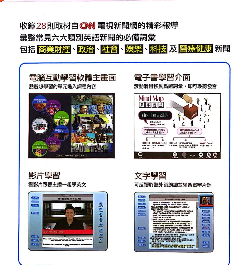本書特別精選近幾年的重要新聞,彙整常見六大類別英語新聞的必備詞彙,收錄28則取材自CNN新聞的精彩報導,包括商業財經、政治、社會、娛樂、科技及醫療健康新聞,並補充說明新聞中的常用句型,讓你在吸收資訊的同時,可迅速掌握各類新聞的重要詞彙與句法,有效提升英文能力,輕鬆掌握全球脈動。