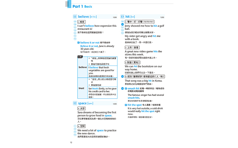 依照書中使用說明步驟輸入序號並登入使用。只要能上網,不限手機、平板、筆電、桌上型電腦,隨時隨地都能使用學習網來學習單字,方便又有效率!條列各單元單字,主要單字在例句中會以藍色呈現,點選可看到例句及單字相關補充,並可透過評量了解學習成效,