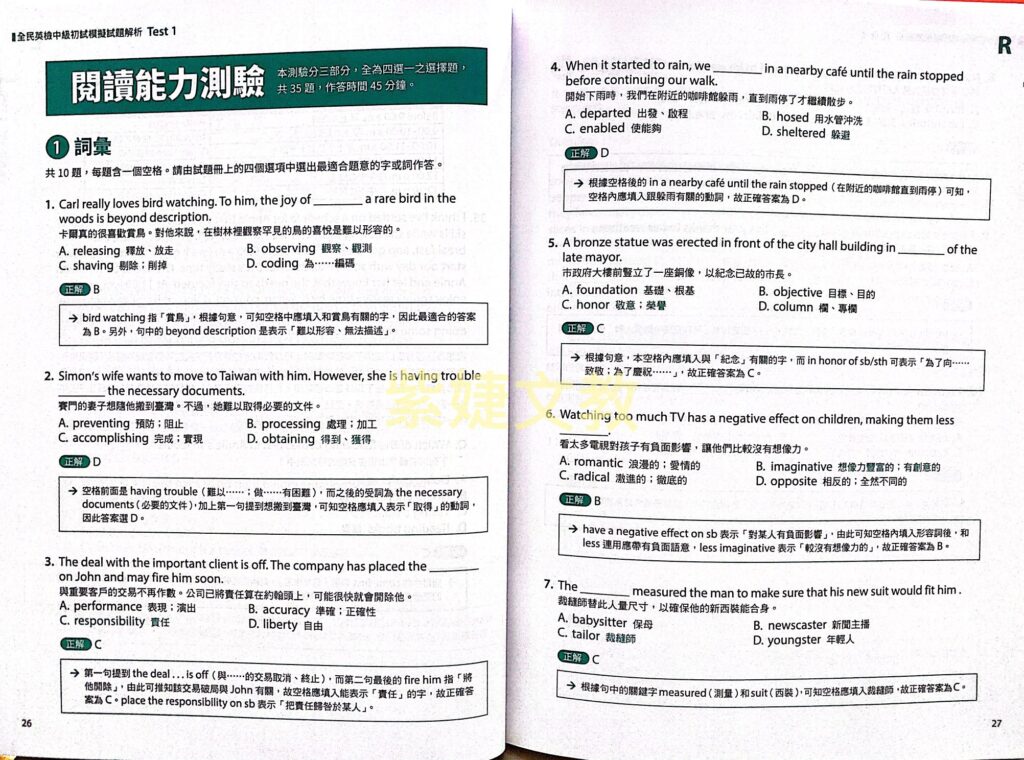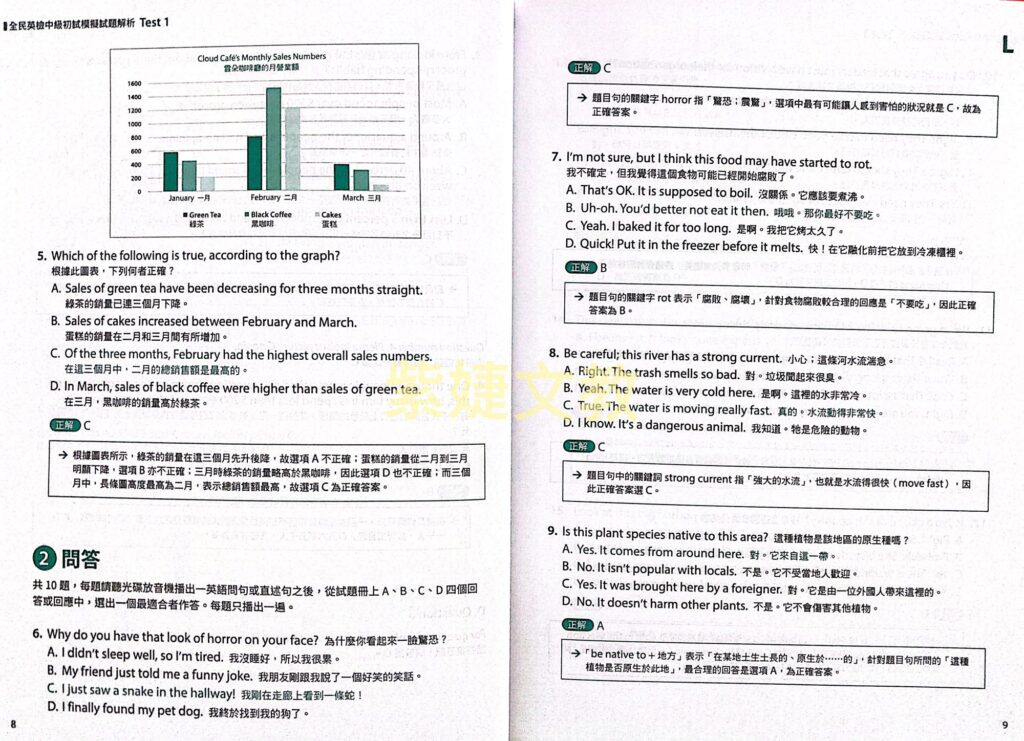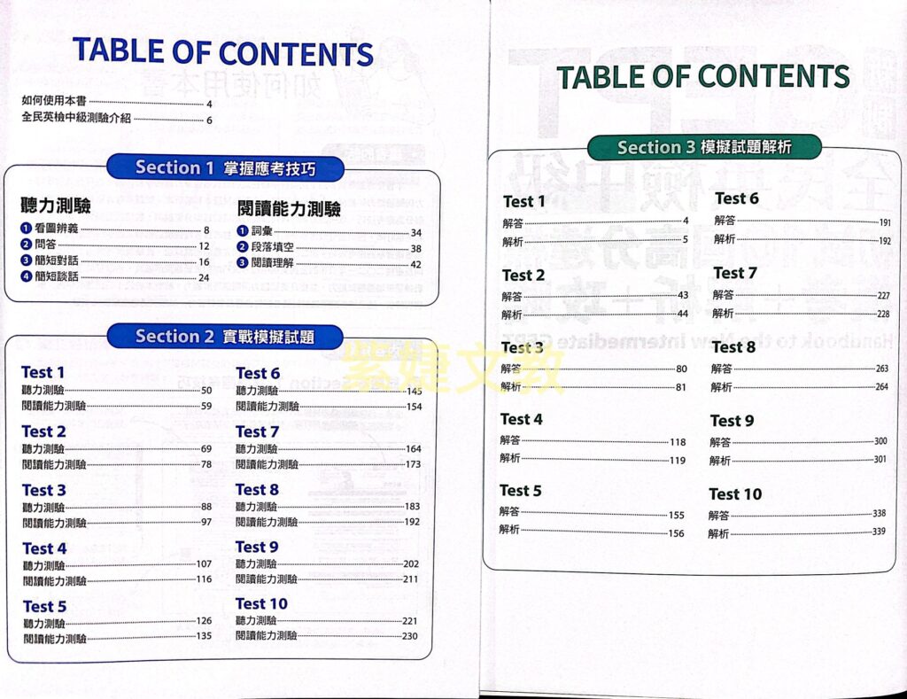 第二部分則收錄十回完整的初試試題,此模擬試題的題型與出題方向是根據二○二一年公布的全民英檢中級考試初試的最新題型所編寫,希望幫助讀者透過實戰練習來增進應試能力,並提升英語聽力與閱讀理解能力。解析本收錄十回試題的中譯、解答與解析,透過解析說明來幫助讀者輕鬆自習及累積實力,以順利通過全民英檢測驗。