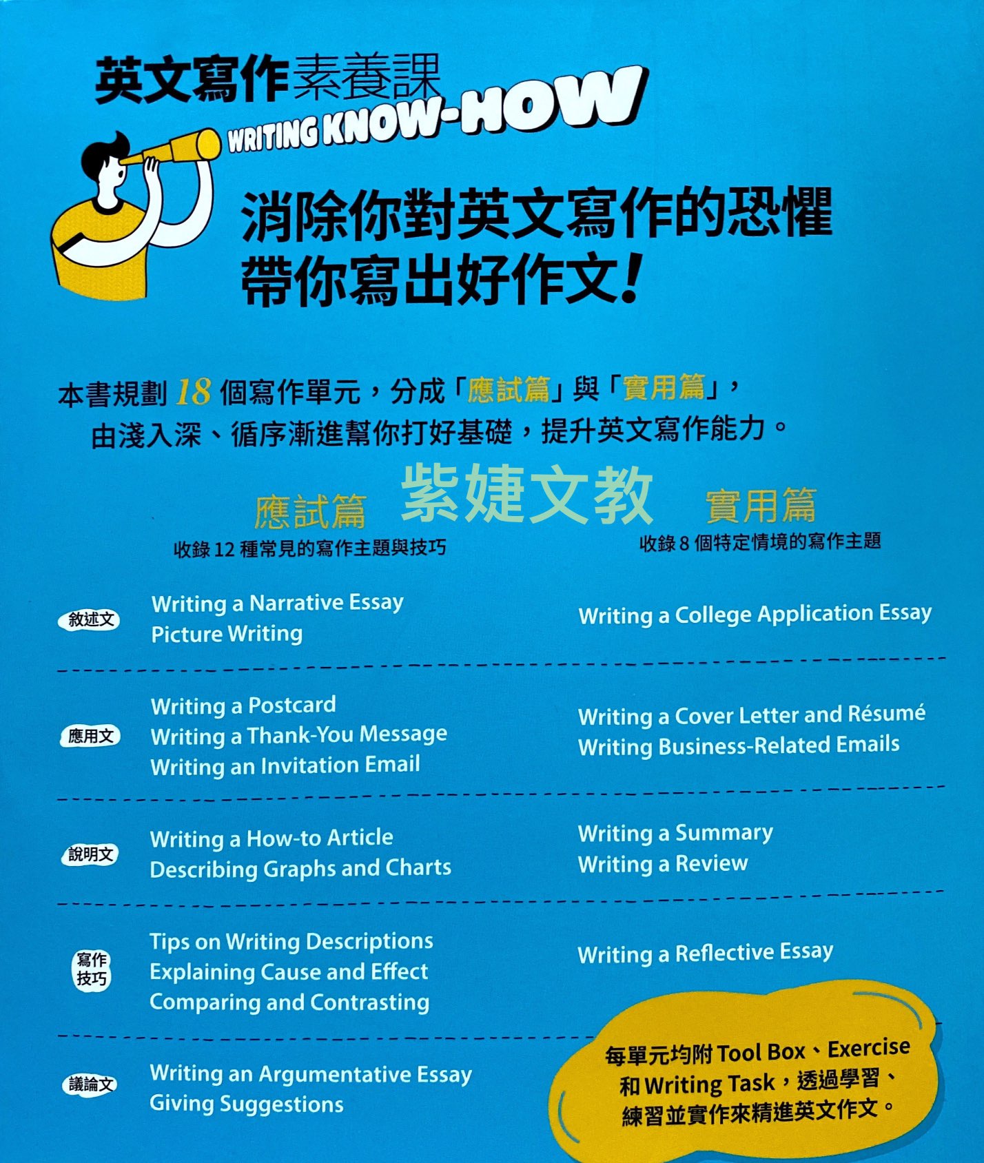 本書規劃18個寫作單元,分成「應試篇」與「實用篇」由淺入深、循序漸進幫你打好基礎,提升英文寫作能力。
