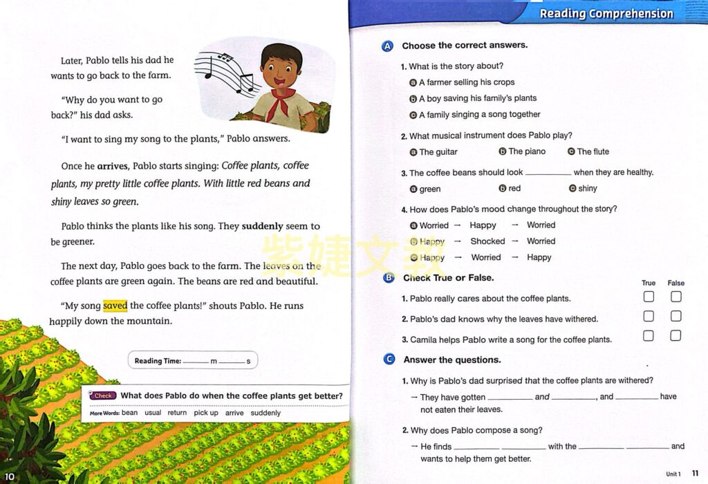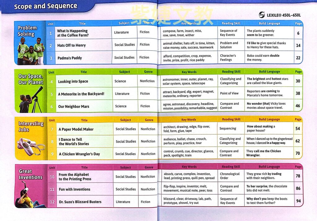 ❷ 主題文章符合SDGs議題,內容取自美國小學教材 ,兼具 Fiction及Non-fiction,精心設計理解問題,幫助學生熟悉內容。