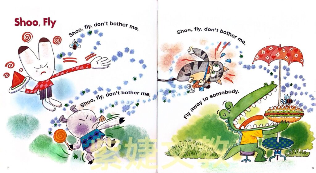 另外,這些歌謠的語言都環繞著生活,因此很自然能在日常中運用,下雨時,可以唱<Rain, Rain Go Away>;有蚊子時,可以唱<Shoo, Fly>;睡前唱<Star Light>來許願;過節可以替換節日唱<We Wish You a Merry Christmas>,由於替換歌詞要音節對應,孩子能夠熟悉英語單詞的音節,為拼音、發音和讀寫英語奠定根基。
