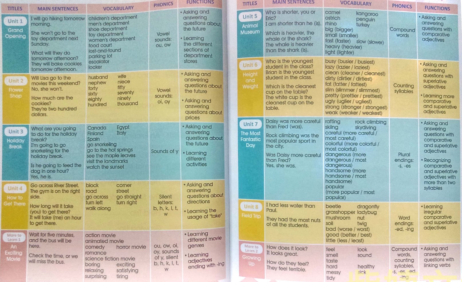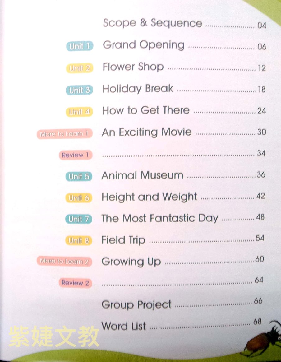 ●孩子到了中階學習階段,文法點加深,讀寫能力會漸漸被培養起來,孩子開始可以閱讀短文,練習引導式短文寫作,慢慢具備可以深度學習英文的能力,為下一階段做好準備。Book 7~8★學習者年紀:小學四年級~五年級