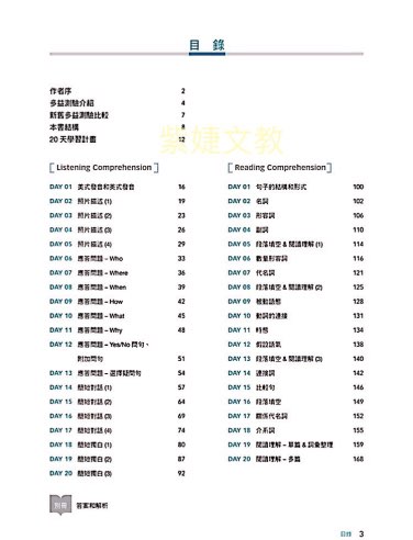 1.了解2018新式多益:將聽力與閱讀的題型、主題、文法、常用字彙語句規劃成20天課程,深入淺出的說明讓您輕鬆理解新式多益。