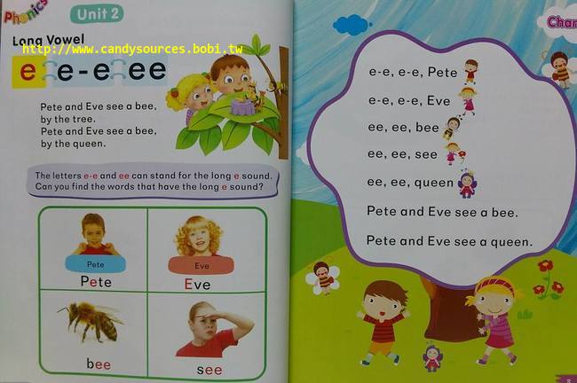 每冊6個單元,每單元皆包含:自然發音規則、代表單字、節奏朗文/短文、複習活動、聽力練習。