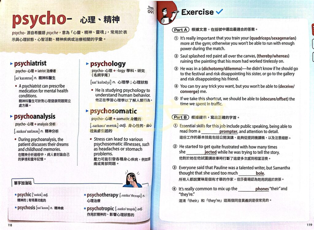 讀者可依照本書架構循序學習,每個單字均附有拆解示例與實用例句,幫助掌握字首、字根或字尾的意義,進而從字形推敲字義,使單字學習從「背誦」轉變為「理解與應用並重」。此外,每篇學習內容後都設計了多元題型的測驗,協助讀者系統掌握單字結構與意義,並即時檢視學習成果。書末更附有分類索引,方便查詢,幫助讀者建立完整的字彙量。