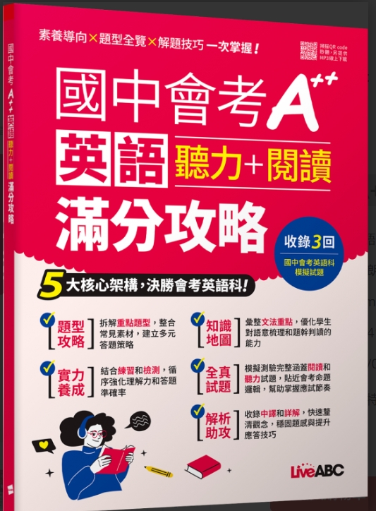 本書所附的朗讀MP3,可掃描封面的QR code或至LiveABC官網下載MP3聆聽專業人士錄製的聽力題,訓練英語聽力能有效訓練聽說能力,從容應試,幫助讀者輕鬆自習和累積實力,在國中教育會考英語科的測驗拿下優異的A++滿級分!