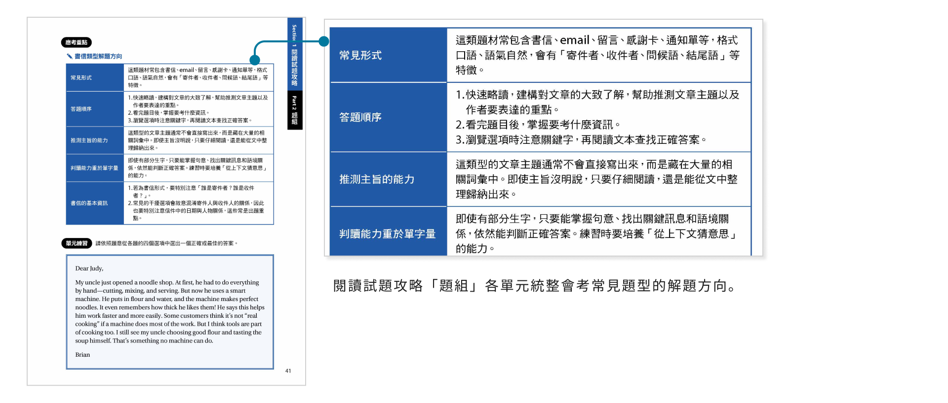 「閱讀試題攻略」的「單題」設計以國中常見的句型和語法為基礎,規劃十二個單元,幫助學生一步步掌握文法要點和語意判斷的技巧。「題組」依照會考閱讀題常見的文本類型,設計九個單元,強化學生的段落理解和訊息整合能力。每個單元皆以自我檢測、應考重點和單元練習為組成元素,讓學生在反覆實作中深化語言知識和應答實力。