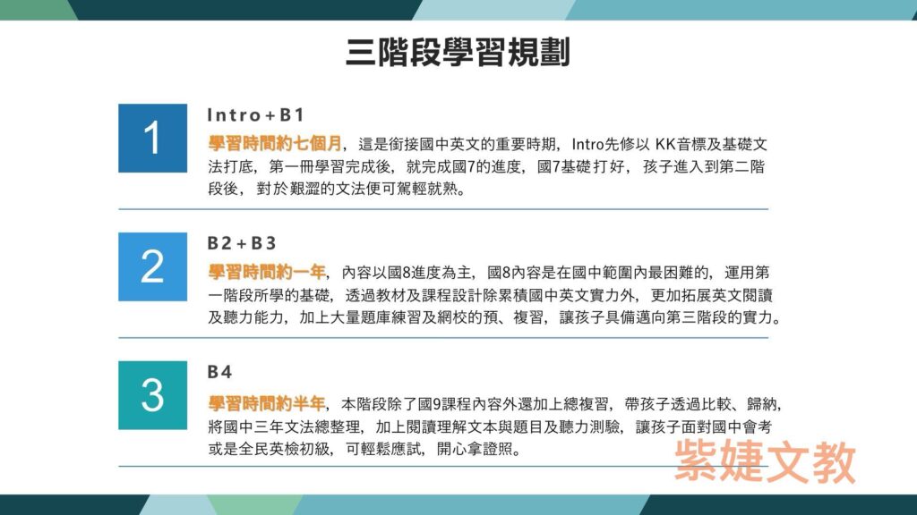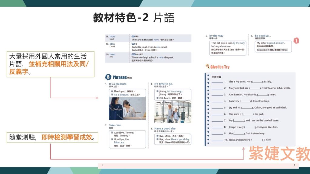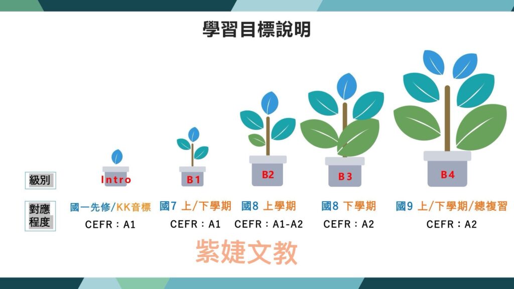●教材架構:全系列共五冊(Intro~B4),與國中課綱平行,整合市面上各版本,補強兒美弱點,提早為國中預做準備。