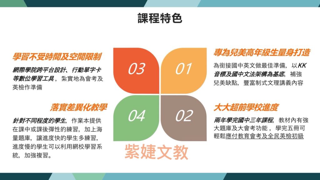 兒美的孩子往往不熟悉國中英文題型及上課方式,國一靠過往的基礎,但在國二到國三就開始覺得吃力。參加「進階英文班」讓孩子在銜接國中前,可以預先為國中做好準備,不浪費過去兒美階段打下的穩固基礎。