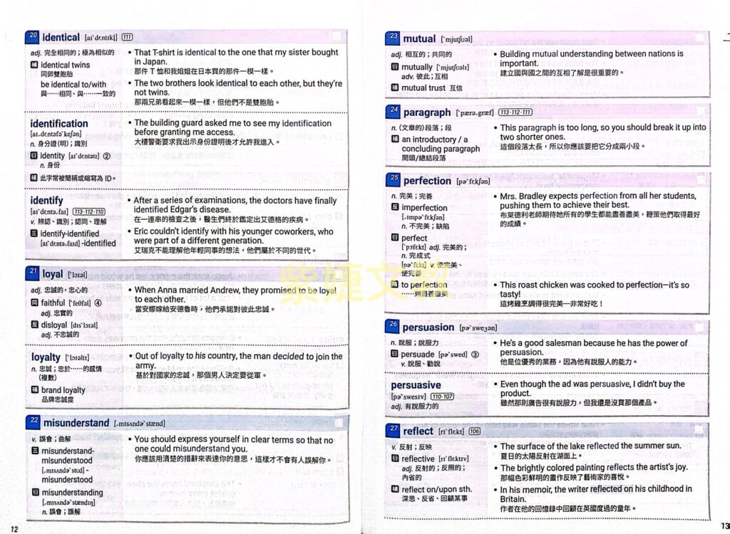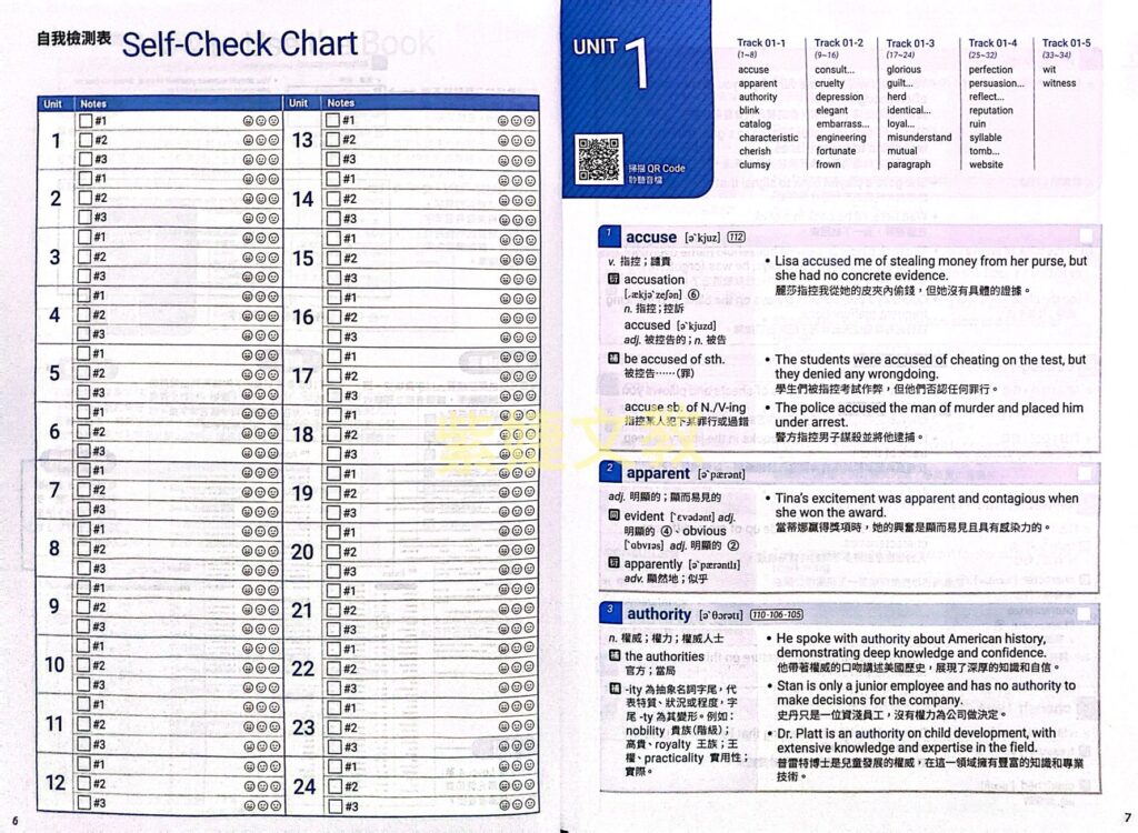 我們參考近十年來學測單字的出現頻率、重要程度、及各版本教科書內容,將Level 4單字平均分配在全書24個單元裡,再依照字母順序做單字的條列式排列。每一個單元約有40~42個主要單字,皆搭配使用例句讓讀者知其用法。版面配置清楚明瞭,節省更多學習時間。
