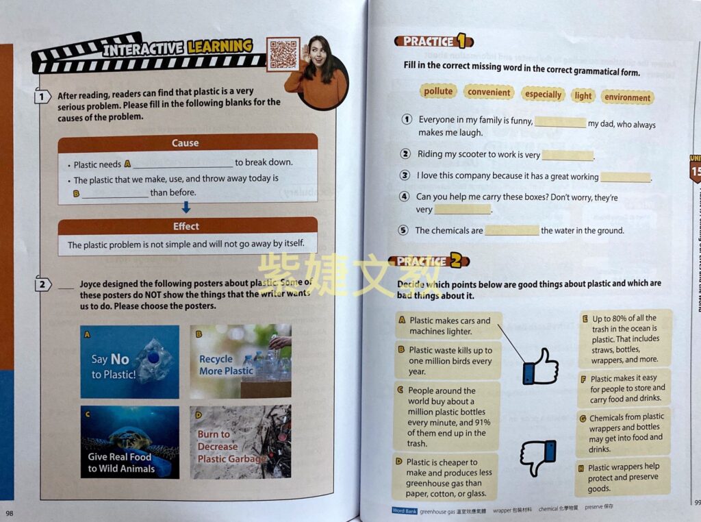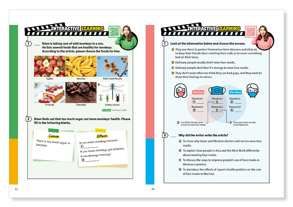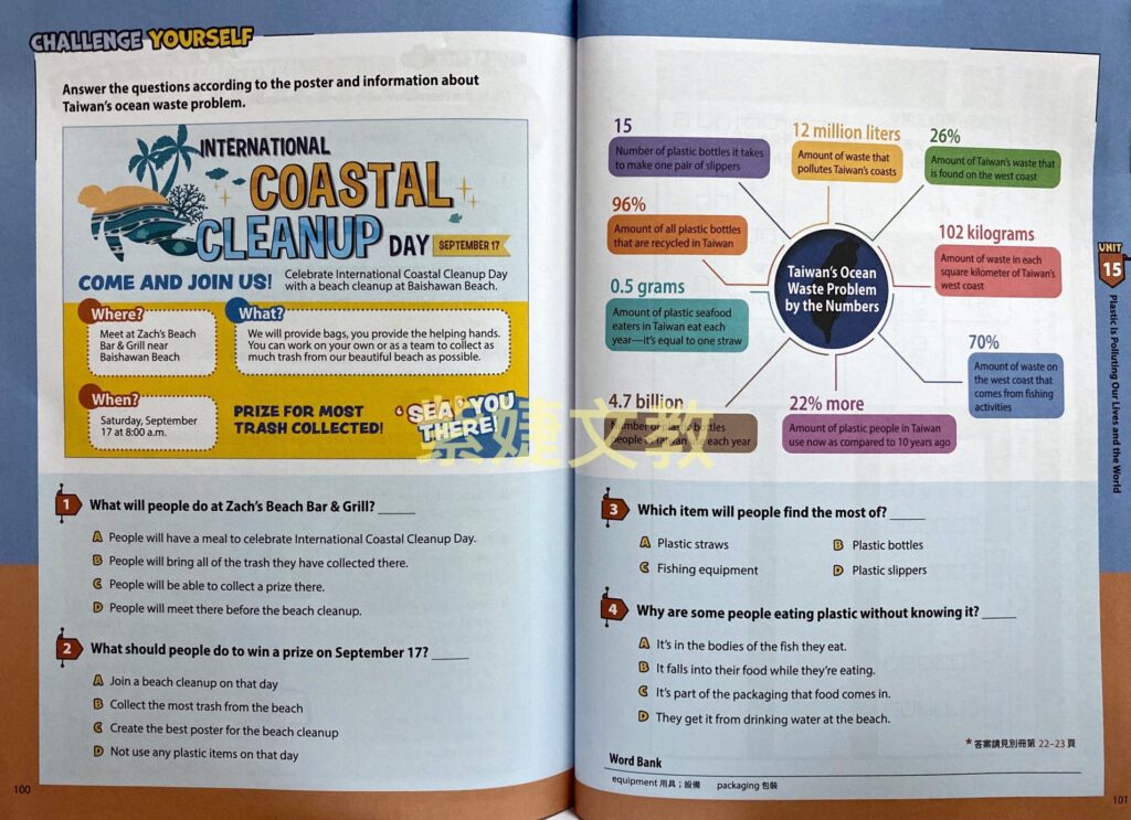 每個單元會設計一道與文章主題相關的素養題,包括圖表、海報、食譜、時刻表以及通訊軟體等各種題型,題目內容與生活情境相關,符合108 課綱的精神。