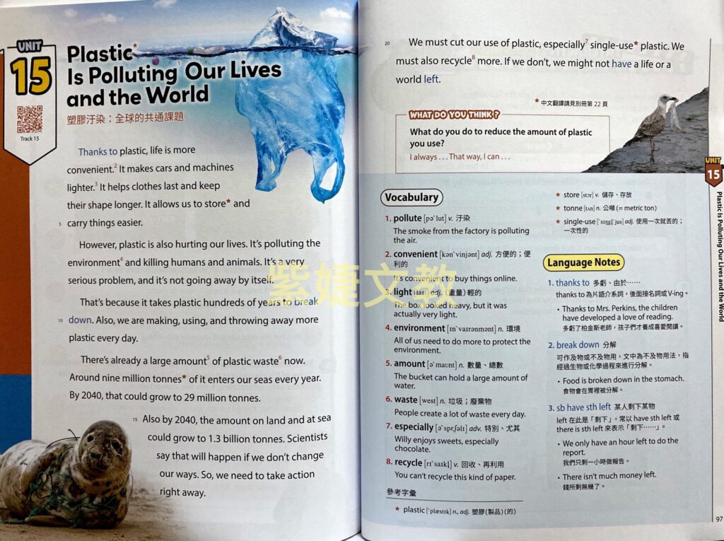 本書因應108課綱的教學方針,共編寫了十五個單元,這些單元包含了口罩文化的生活主題、探討巧克力工廠的童工問題、世界各地的熱門節慶、午夜太陽的自然奇觀以及新興行業動物溝通師等,主題豐富多元。透過閱讀這些單元,讀者不僅能夠訓練閱讀能力,還可以激發學習興趣、吸收新知識並拓展知識領域。