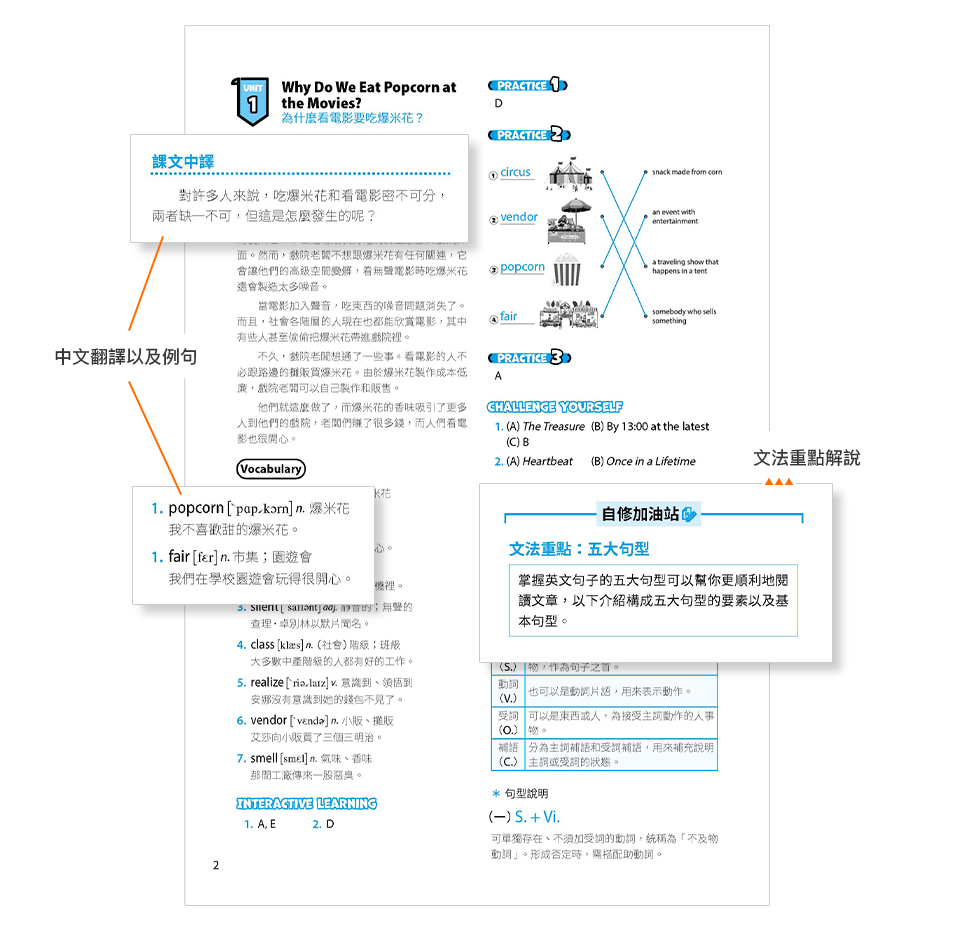 每單元的中文翻譯、例句中譯及測驗解答均收錄在別冊中。每單元都會從文章中挑選一個文法重點來加以說明,幫助您複習重要的英語語法。