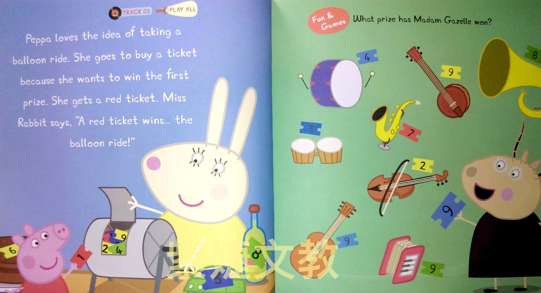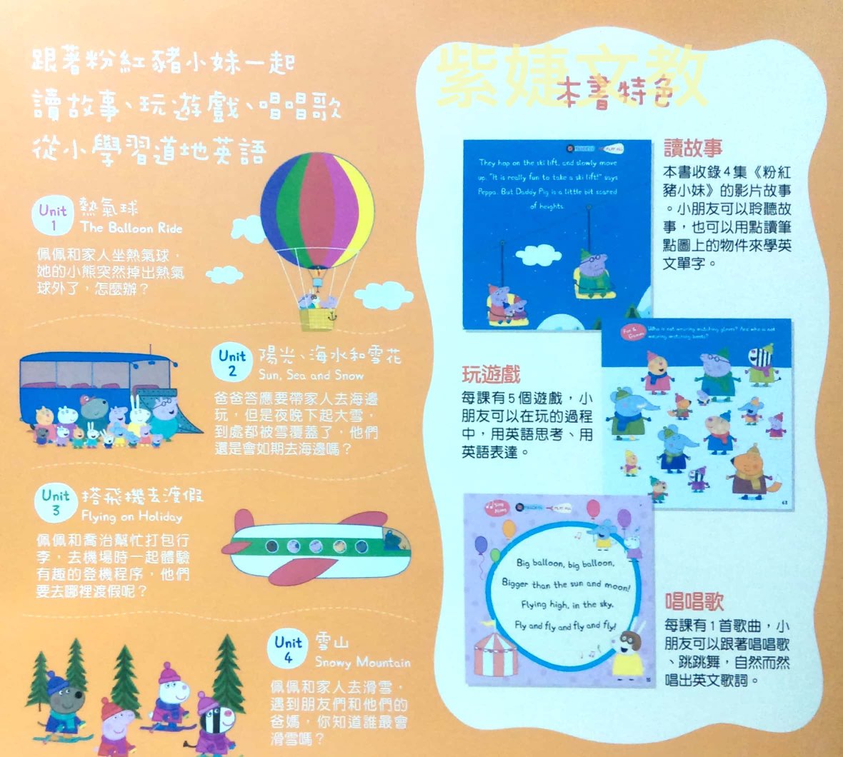 #粉紅豬小妹教你說英語:佩佩過聖誕節 試閱 https://issuu.com/cnn-magazine/docs/tk_4deaa6f7d7af07/2 本書有4個主題故事,每個故事都有5個遊戲和一首歌曲。小朋友在閱讀故事的時候,可以停下來玩一玩遊戲或聽一聽佩佩和她的朋友們在影片裡所唱的歌。現在就準備好,一起在閱讀、唱歌、玩遊戲中快樂地學習吧!