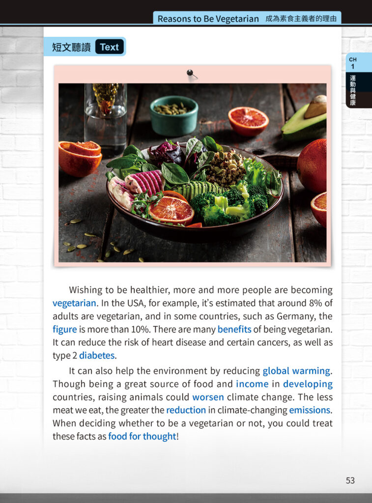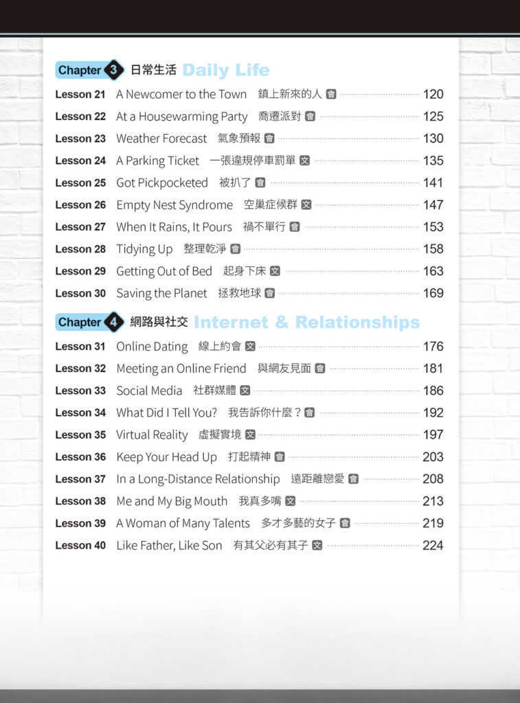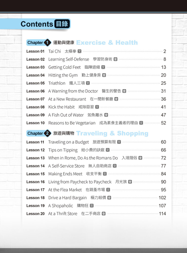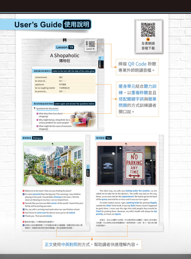 2. 正文使用中英對照的方式,幫助讀者快速理解內容,其後則列出該課重點單字片語,幫助讀者記憶與運用。