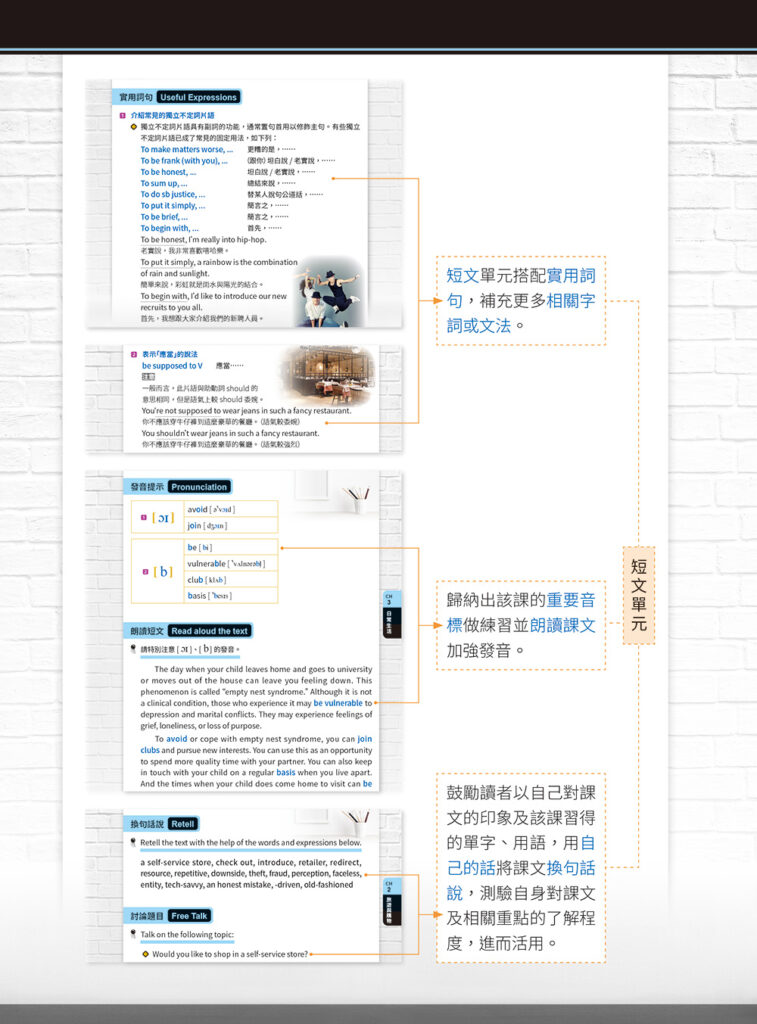 4. 短文單元則搭配實用詞句,補充更多相關字詞或文法;並且歸納出該課的重要音標做練習並朗讀課文加強發音。最後鼓勵讀者以自己對課文的印象及該課習得的單字、用語,用自己的話將課文換句話說,測驗自身對課文及相關重點的了解程度,進而活用。