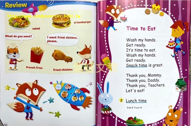 從豐富的大圖故事中,透過故事情境引導出常用對話與主句型。