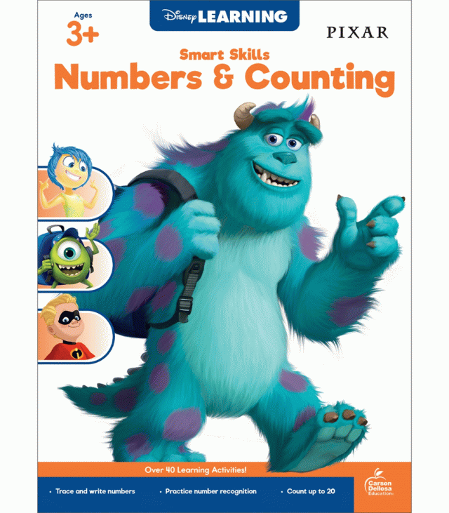 The Smart Skills: Numbers and Counting activity book provides hours of engaging exercises to help young learners practice writing numbers, identifying numbers, and counting alongside their favorite Pixar characters including Sulley, Joy, and Elastigirl.