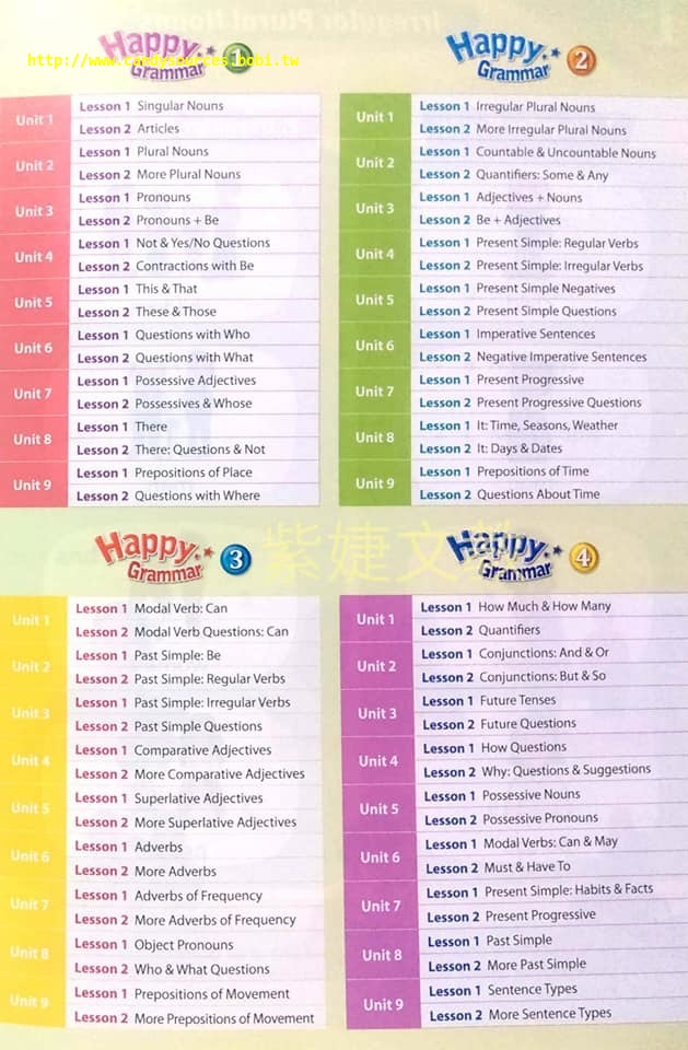 Happy Grammar is a four-level series designed for emergent students of English, and it focuses on fundamental grammar structures. The aim of the series is to teach the beginning principles of grammar, correct usage, and composition. The books explain elementary grammar theories with helpful illustrations and photographs. The kid-friendly layout and interesting activities encourage students to participate. The series can be used at home or in the classroom, and it contains an abundance of useful exercises which give students the opportunity to consolidate what they have learned.