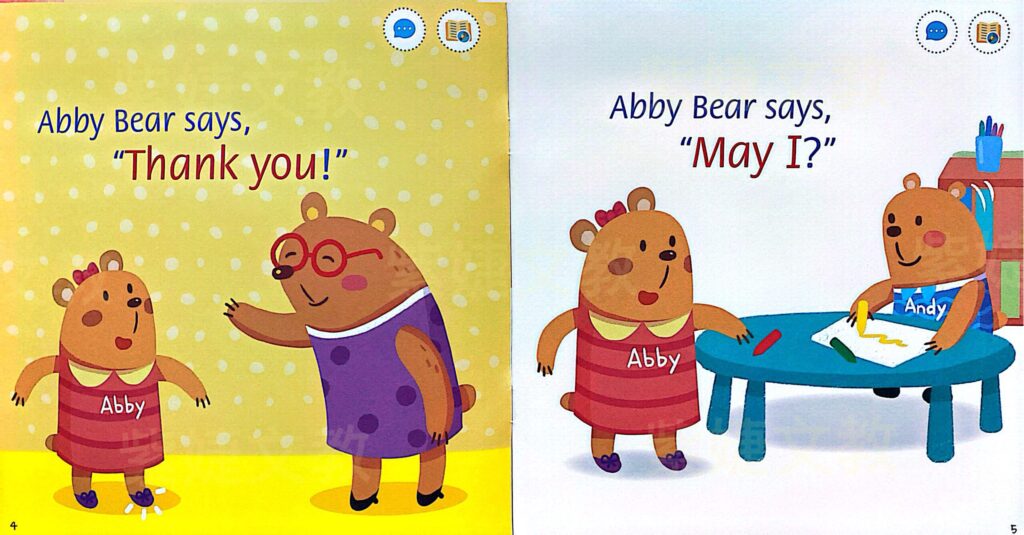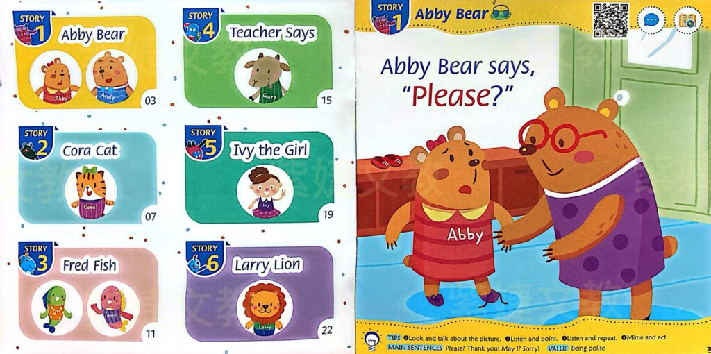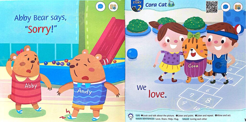 • 品格教育:教材結合說好話、好行為、彼此相愛、建立自信、保持清潔等品格美德,學美語也在養成好品格。