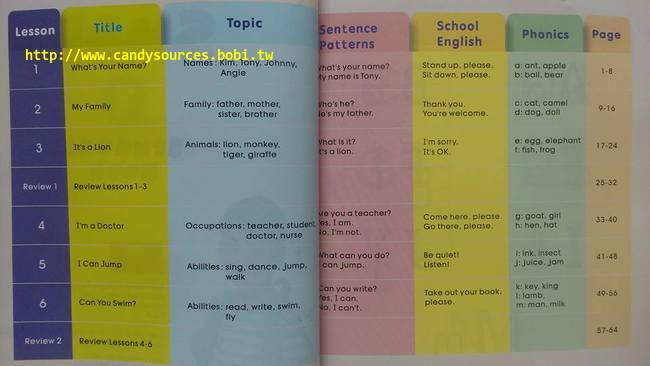 主要句型環環相扣,循序漸進,例如:Unit 1中先教 My name is Tony. 再引出相關問句 What’s your name?