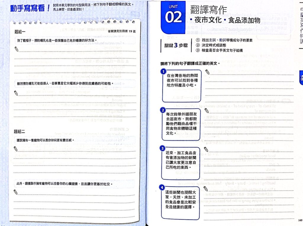 中翻英寫作特訓則是著重在中英文兩種語言轉換的能力,在下筆翻譯前,要先能決定句子的主詞、動詞、受詞等基本要素,以及判斷英文時式或語態的能力。每句中翻英的解析除了提供參考答案外,還有翻譯訣竅,幫助讀者逐步掌握句子翻譯的思維模式。同時因應時代話題趨勢,提供線上教育、人工智慧等時下討論的生活主題內容。