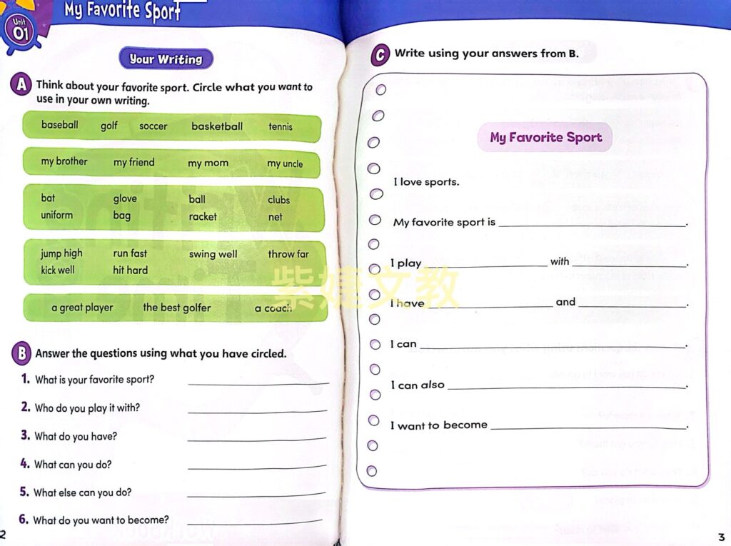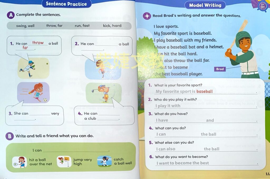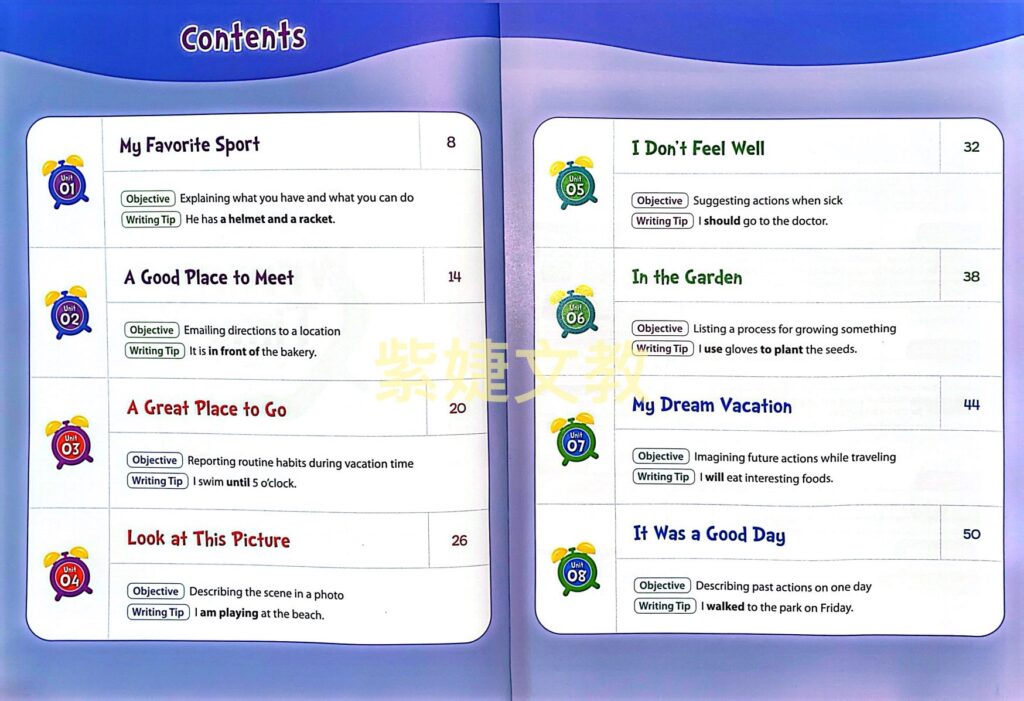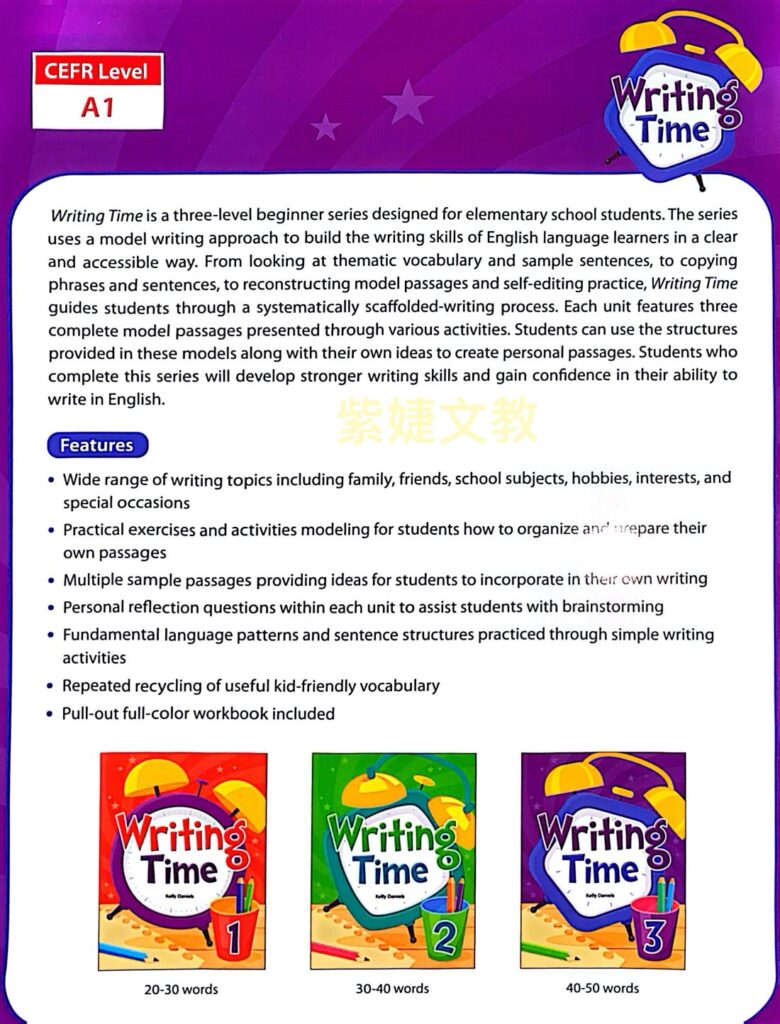 - is a three-level beginner series designed for elementary school students. The series uses a model writing approach to build the writing skills of English language learners in a clear and accessible way. From looking at thematic vocabulary and sample sentences, to copying phrases and sentences, to reconstructing model passages and self-editing practice,
