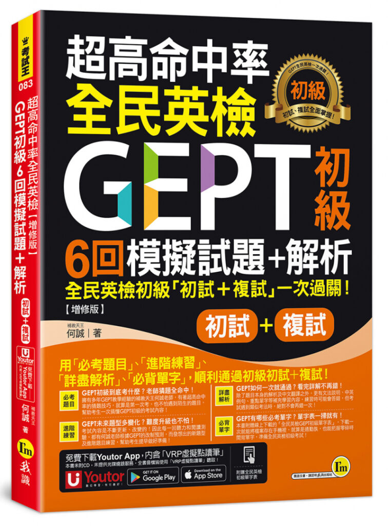 超高命中率全民英檢GEPT初級初試複試6回模擬試題+解析【增修版】(附贈「Youtor App」內含VRP虛擬點讀筆+線上下載全民英檢初級單字表)
