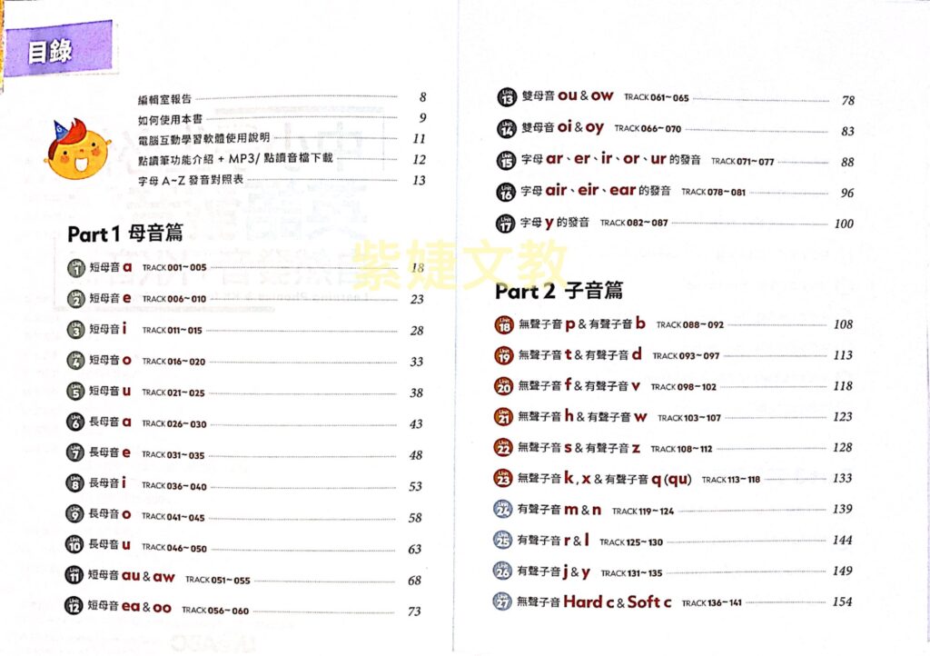 本書共分為四大主題(共30 個單元),每個單元都是有趣又常見的生活情境,內容合乎108課綱的核心素養,讓孩子不僅學英語也能學到其他領域的相關知識。另外,每個單元的規畫都是依循著三大方面:「課前準備」、「情境會話」、「課後練習」安排。