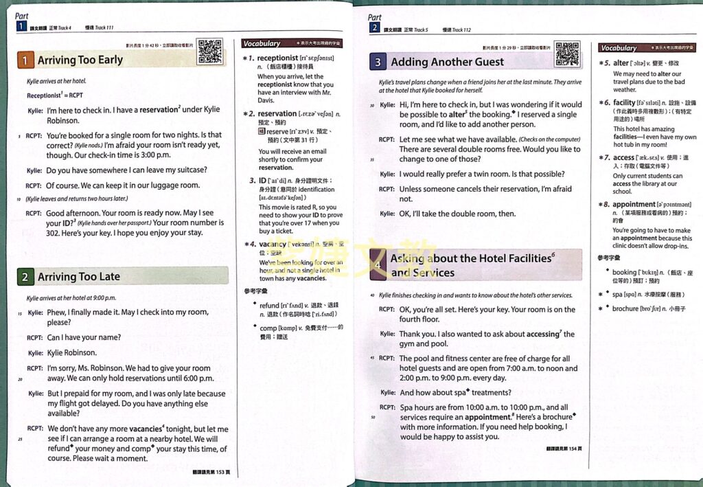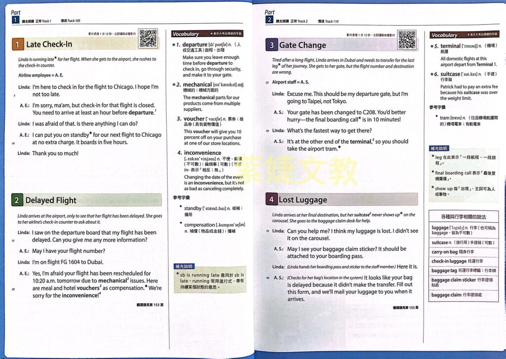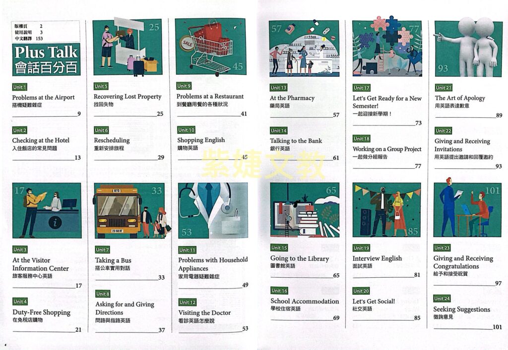 本書透過36個實用的主題對話,結合真人拍攝的影片,教你如何在不同的生活情境中運用英語會話。每個單元都搭配精選的實用短句,讓你能輕鬆應用在日常生活中。收錄的主題包括旅遊必備的〈搭機疑難雜症〉、〈入住飯店的常見問題〉、〈旅客服務中心英語〉,以及與購物相關的〈購物英語〉和〈家用電器疑難雜症〉等等。此外,還有留遊學時可派上用場的〈學校住宿英語〉、〈一起迎接新學期!〉、〈一起做分組報告〉,以及〈面試英語〉、〈社交英語〉等,主題多元又實用!