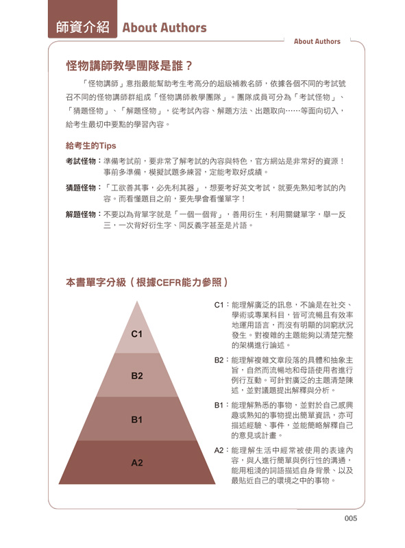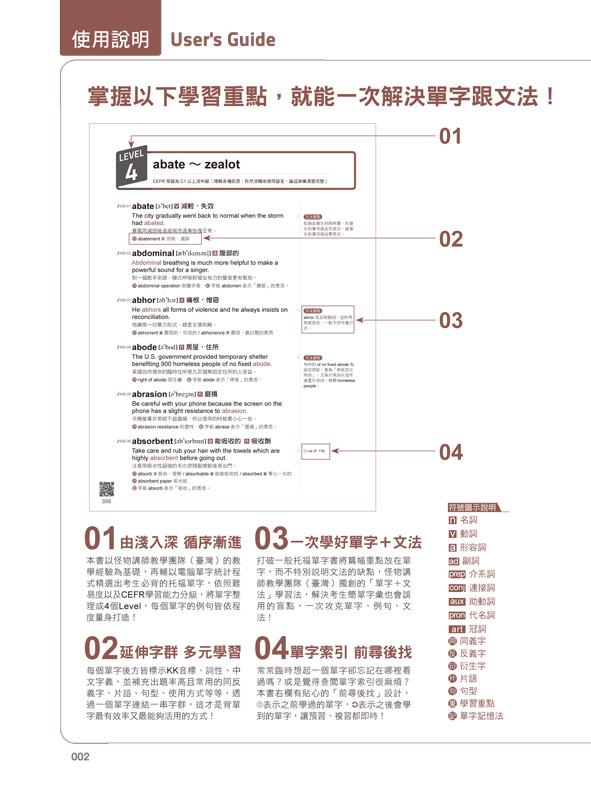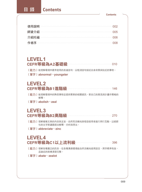 本書以怪物講師教學團隊的教學經驗為基礎,再輔以電腦單字統計程式精選出考生必背的托福單字,依照難易度以及CEFR學習能力分級,將單字整理成4個Level,每個單字的例句皆依程度量身打造!