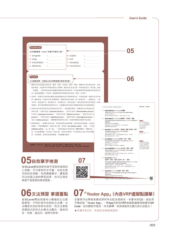 利用數位工具結合文字、紙本可使學習效果加倍!為了引起讀者的學習興趣、即時反饋學習成效,本書附贈「Youtor App」,只要利用App內附的VRP虛擬點讀筆掃描QR Code,就可聽單字發音、中文解釋,快速增進英文聽力與口說能力!