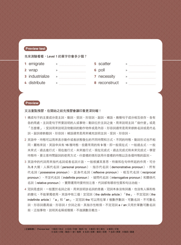 每個Level最前面都有單字預習和單字複習的小測驗,不只檢測中文字義,也包含單字的詞性理解,利用幾題題目,讀者既可以知道之前的學習成果,也可以預先掌握下個章節的學習重點。