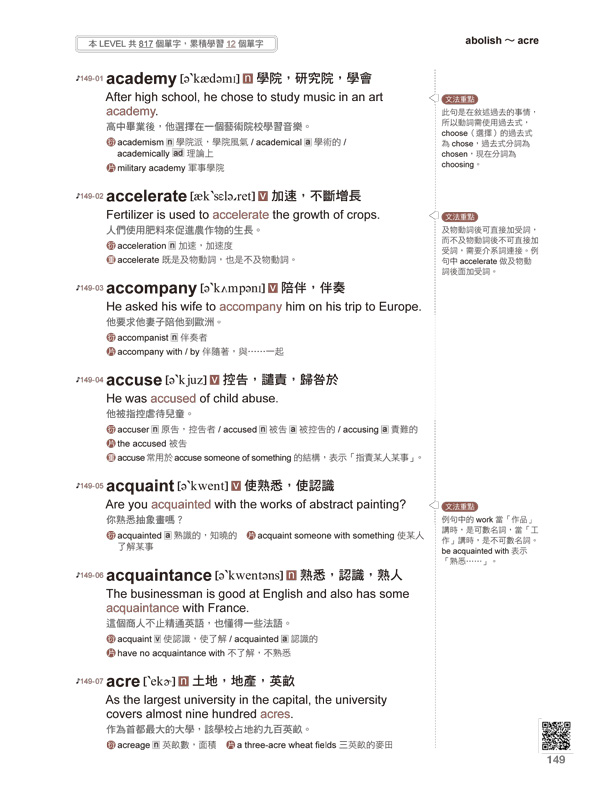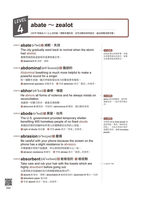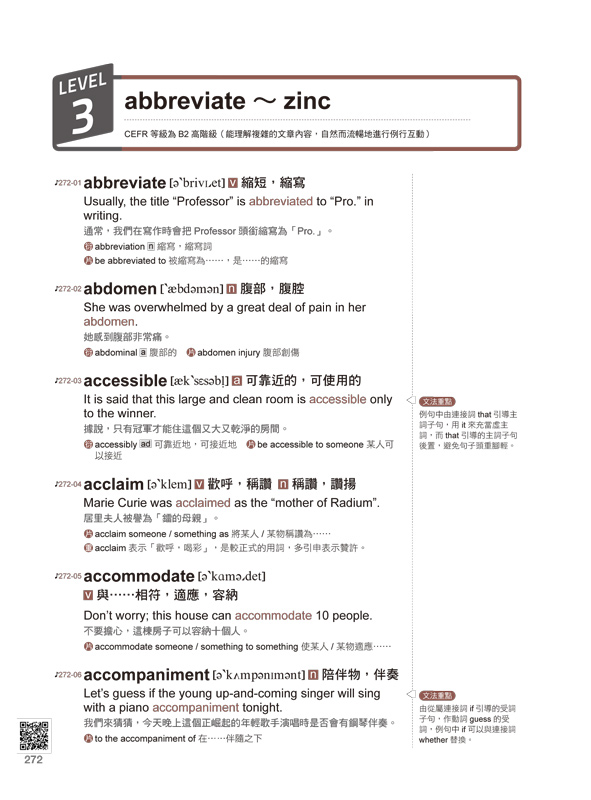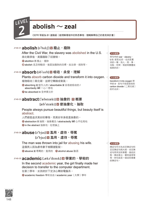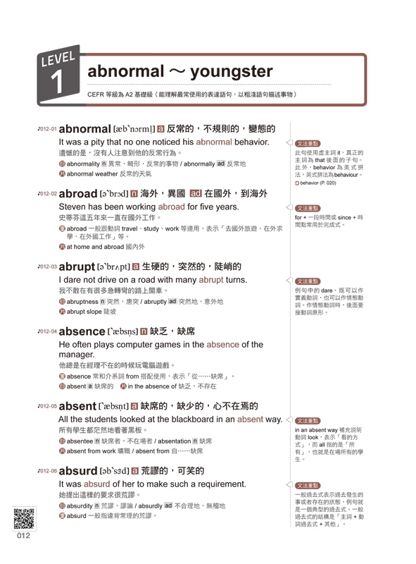 每個Level開始前會有小篇幅的文法重點整理,不同於單字右側的文法欄,文法欄偏重在單字的例句說明,而章節前的文法重點是概括式的英文必備文法觀念,諸如詞性、時態、直述句、疑問句等等。