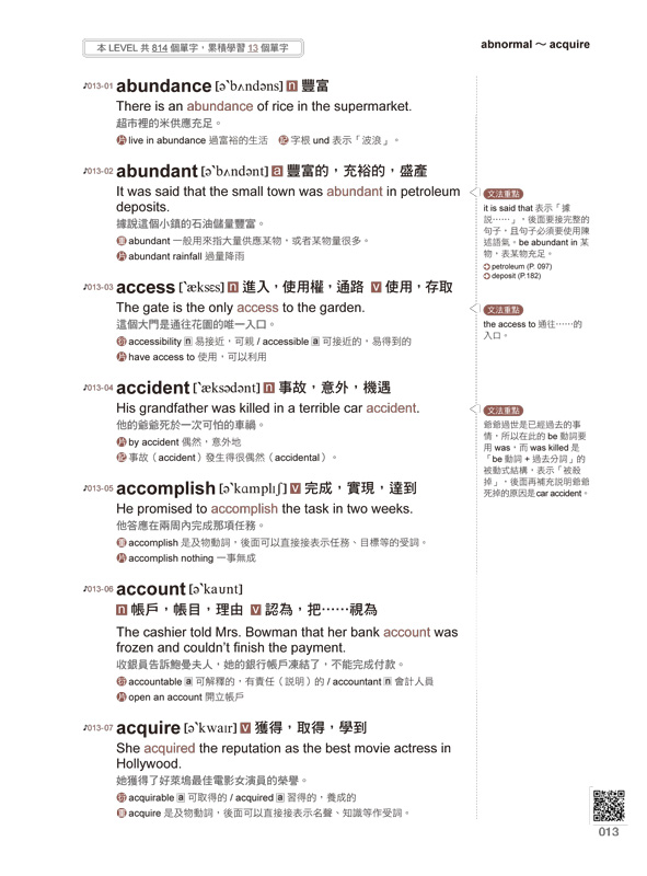 「面對單字,理解單字,使用單字」,只有單字表的書對英文沒有太大幫助,一本搭配文法學習的單字書,考生才能真正理解文句的脈絡,而不用耗費太多時間在純文法書上,還能迅速學會運用單字!