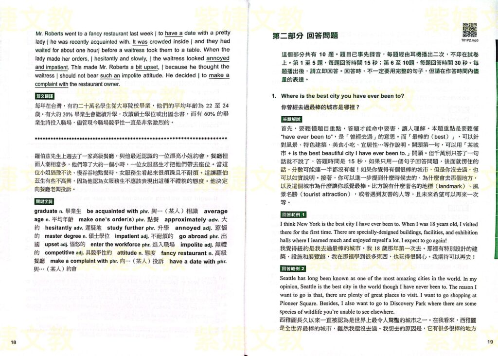 第二部分「回答問題」的「答題解說」,提供考生應對各種試題情境的應對策略,並且幫助考生在考試時有效地找出最符合邏輯的回答,並達到考官給予高分的標準。