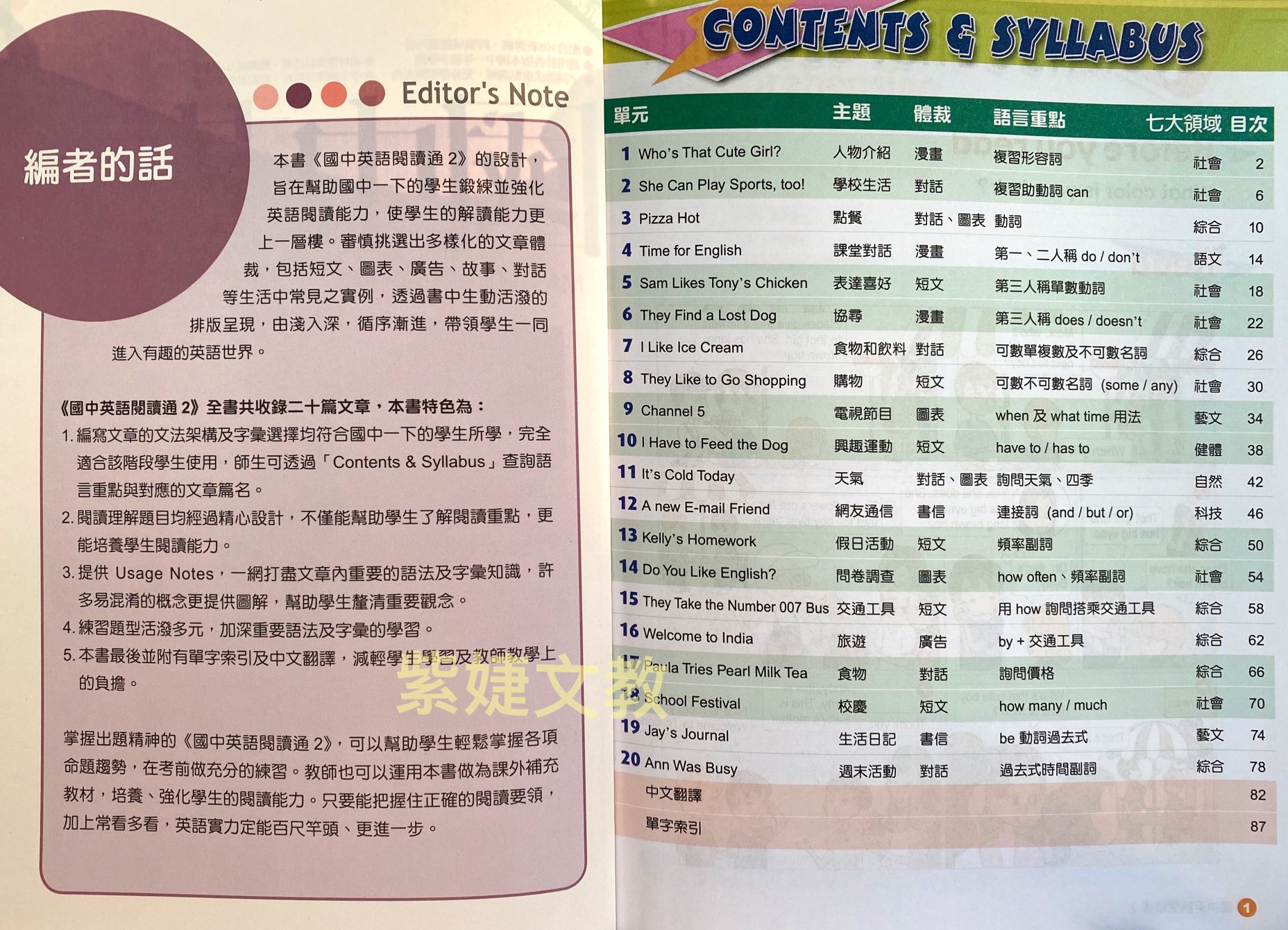 1. 編寫文章的文法架構及字彙均符合國中一上的學生所學。