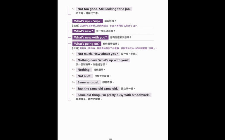 狂背大量的單字、搞懂艱深的文法、練習句型寫作一遍又一遍,學習英語好像很辛苦又花時間,卻不敵老外一句簡單的「What’s up?」就可以讓你啞口無言,「不知道怎麼回應」、「這個場合適合這樣說嗎?」,這樣的獨白常常在心中出現,緊張加上辭窮,導致英語說起來零零落落,詞不達意,當下只有一個「冏」字可以形容!