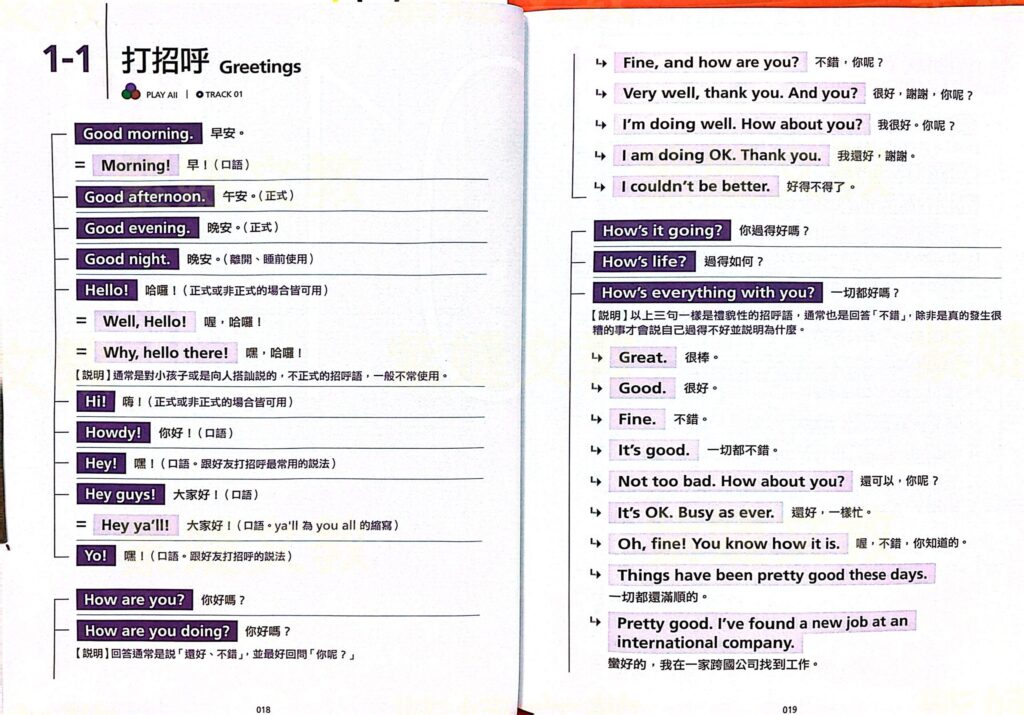本書除了條列直述句之外,也會針對問句提供許多可以回應的答句。在對談和問候的會話過程中,光知道該說什麼還不夠,最好是面對別人的提問時知道該怎麼回應,因此本書設計了問句答句的句組架構,讓你不只會敘述,還會向人提問或回答問題。