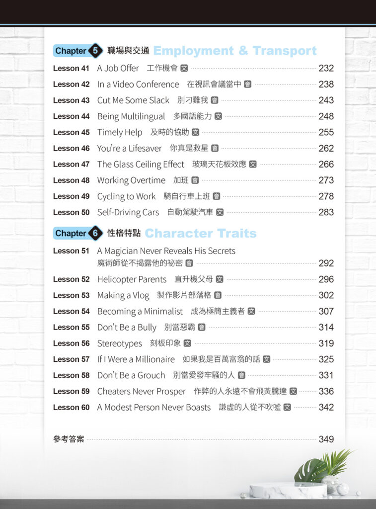 5. 最後討論題目的單元,鼓勵讀者與一同學習的夥伴分享自身相關經驗。而全書所有單元皆附參考答案,提供讀者練習、對照。