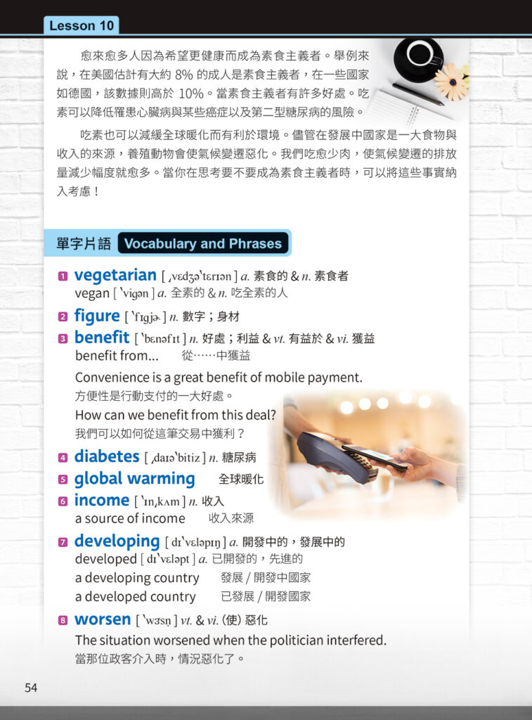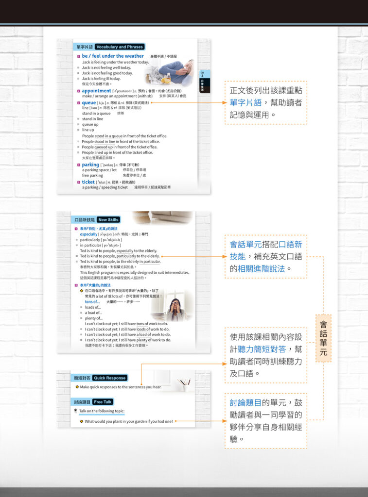 2. 正文使用中英對照的方式,幫助讀者快速理解內容,其後則列出該課重點單字片語,幫助讀者記憶與運用。