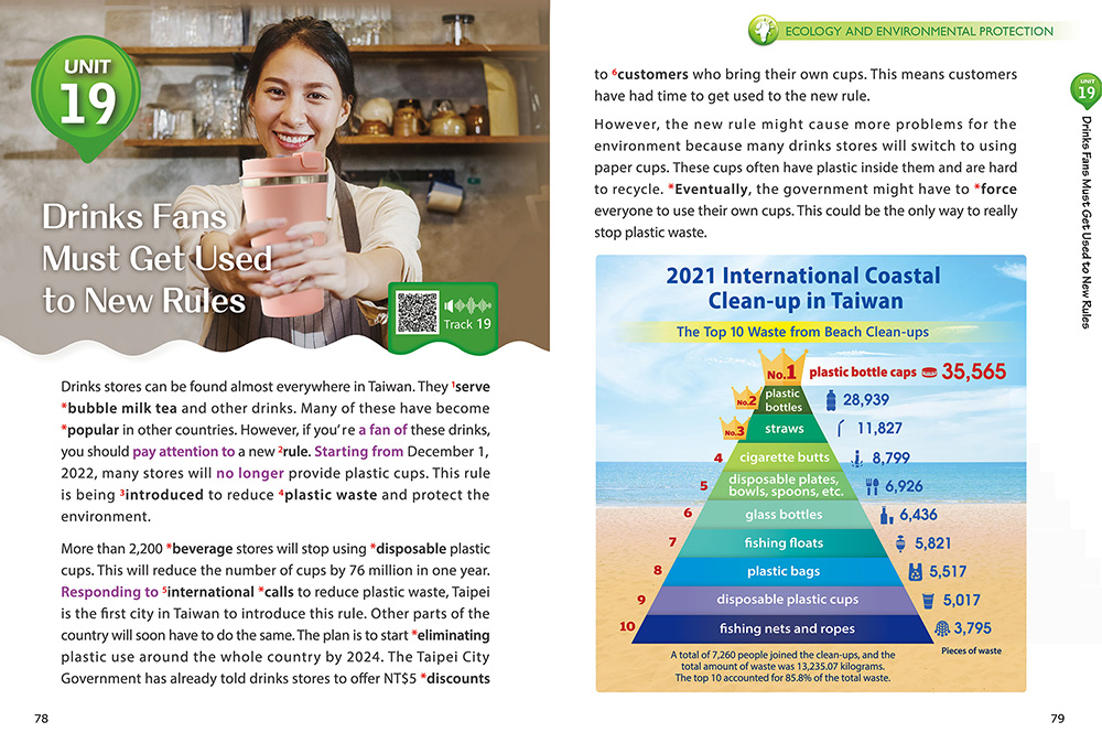 內容以跨領域結合生活化情境為主題,包含科學與技術、時事與生活、地理與自然、生態與環保、歷史與文化、醫學與保健六大領域。幫助學生習得各領域常見議題與相關用語,提升閱讀的深度與廣度。