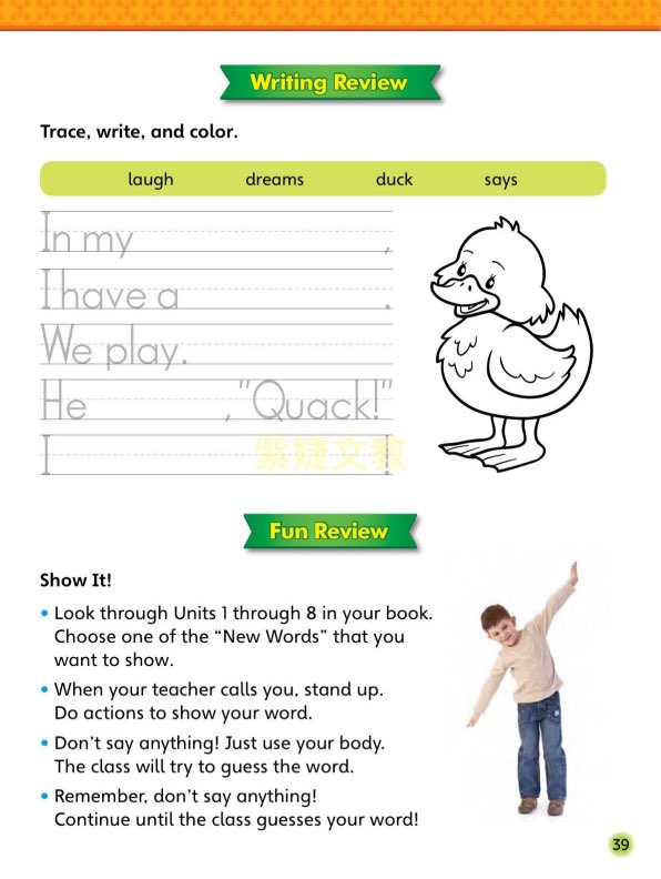 版面:精美大圖呈現閱讀篇章,激發學生的主題背景知識(background knowledge),同時亦降低學習焦慮感。練習題頁面則以簡潔的編排方式,讓教師及學生易於瞭解教學/學習重點。