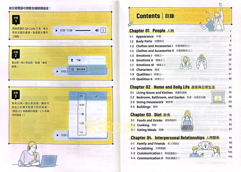 掃描QR Code聽音檔最便利:掃描音檔QR Code隨時聆聽專業美籍外師朗讀單字及例句,邊聽邊記,效果加倍!