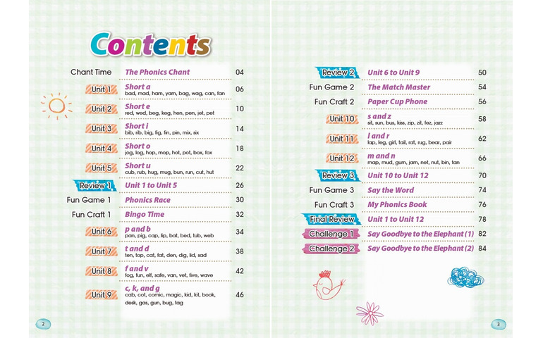 - 6個遊戲單元及手作單元,讓學生藉由簡單的勞作和團體遊戲,在玩樂中複習主單元的發音規則。