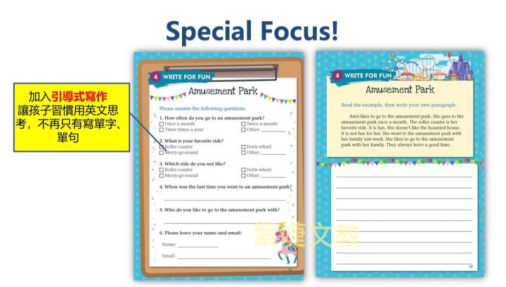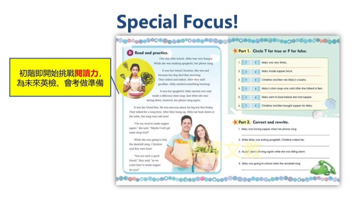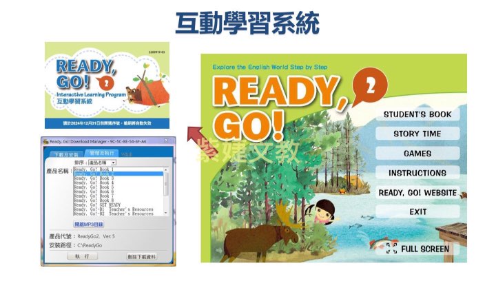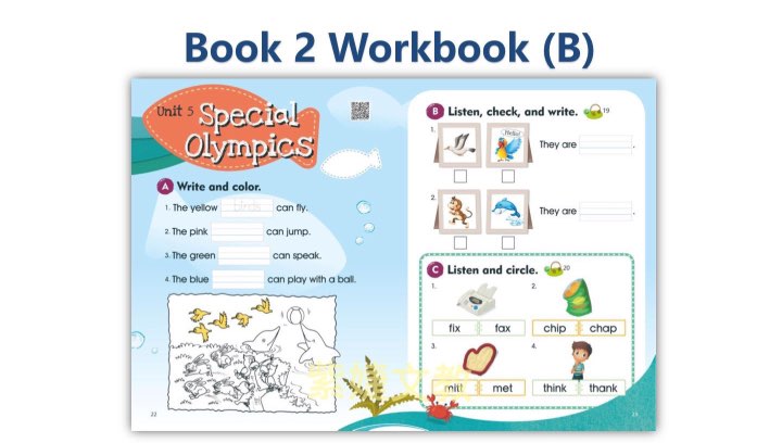 2、作業本A/B共兩本 3、故事讀本 4、線上作業平台(Online Homework) 5、親子共學APP 6、互動學習系統 7、智慧點讀筆(選配) |