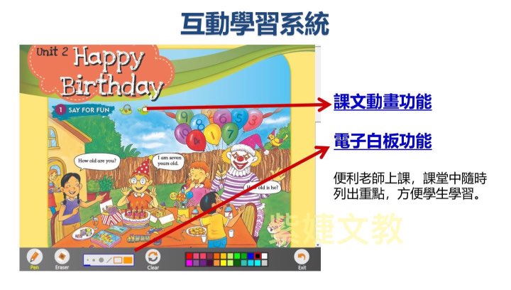 搭配『點讀筆』、『互動學習系統』、『親子共學APP』等科技學習工具,學習有趣、有效果,貼心學生,方便教師,讓學生聽說讀寫樣樣精通!